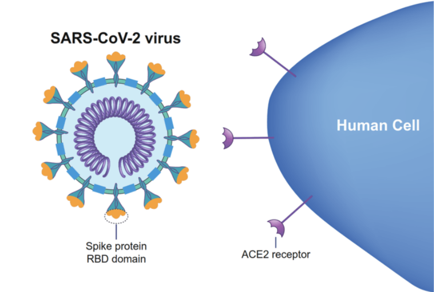 The SARS-CoV-2 virus invades your cells by attaching its spike protein to the cellular ACE2 receptor much like the interaction of a “lock and key”. Once inside, the virus takes over cells and forces them to produce more replicates of the virus, causing COVID-19 infection.